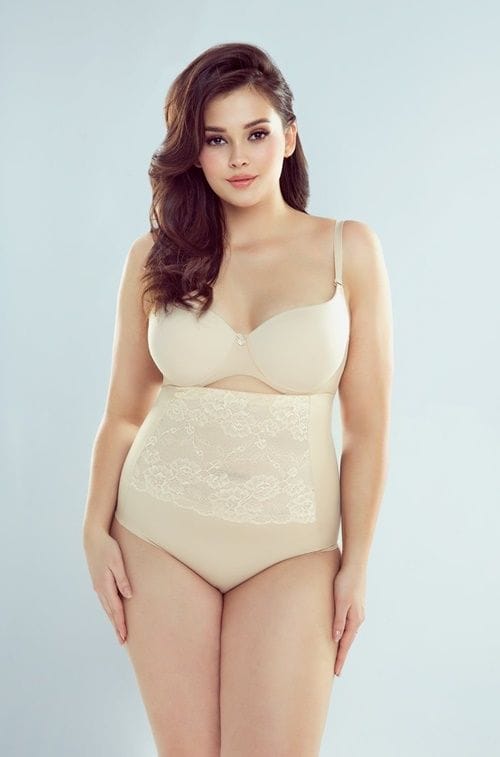 High briefs correcting the waist and modeling the tummy zone. Decorated at the front with a wide, lace belt. The bottom is laser cut, so it does not stand out under clothes. At the top (from the inside) there is a silicone strap, thanks to which the underwear does not slip. Composition: 85% polyamide, 15% elastane.