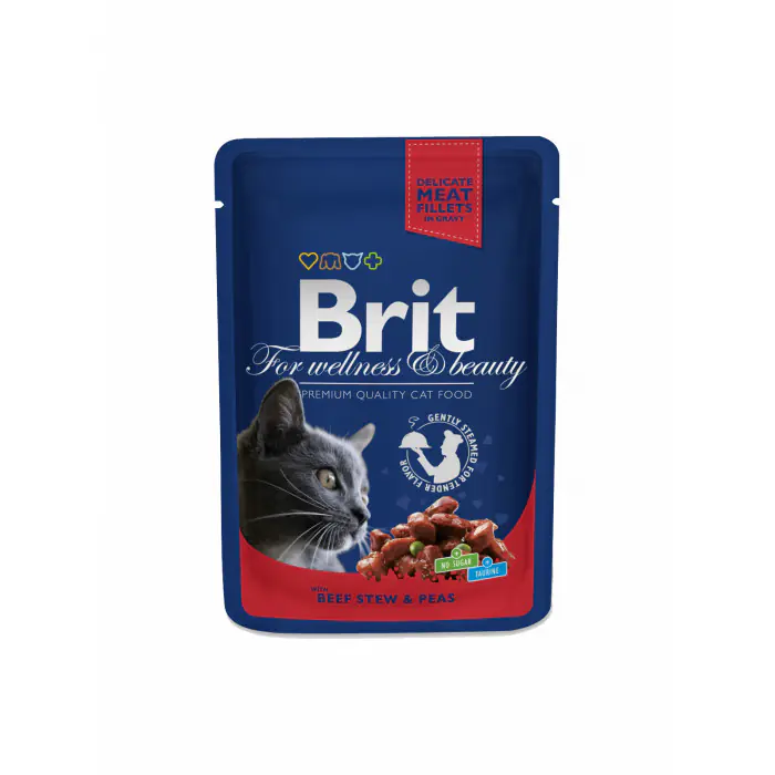 BRIT Premium Pouches with Beef Stew & Peas is a premium food, ideally suited for adult cats. Delicious and healthy, it is perfect for cat gourmets. It provides the cat with all the vitamins and minerals it needs.