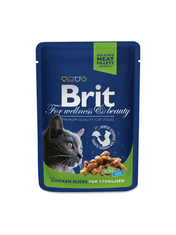 BRIT Premium Cat Pouches Chicken Slices for Sterilised is a premium food ideal for adult sterilised and neutered cats. Delicious and healthy, it is ideal for feline gourmets. It provides the sterilized cat with all the vitamins and minerals it needs.