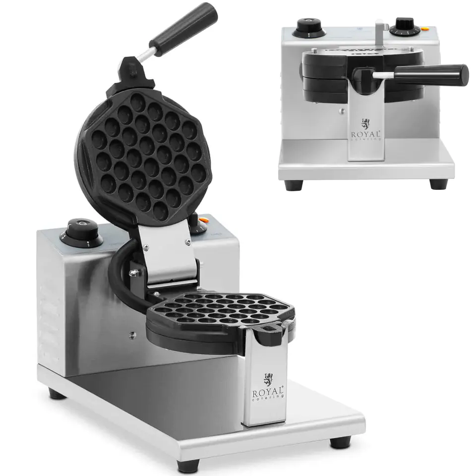 The Royal Catering waffle iron will work in a restaurant, café, bar or outdoor events for preparing crispy waffles. The device has a temperature control in the range of 0-200C. The timer is set in the range of 0-5 min. High power allows for quick and effective preparation of a waffle with a large thickness of 25 mm and a diameter of 170 mm. The structure of the device provides a typical pattern of bubble waffles. The waffle iron housing is made of high quality stainless steel. It has an elegant design and is easy to clean. Two baking plates are made of aluminum with Teflon coating. The heating plates can be replaced in case of wear. Suitable plates are Royal Catering 10012630.
