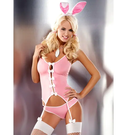 A mischievious cosutme of a bunny includes top with garters, panty, soft stockings and bunny ears as a headwear. In front, the top is cut and is connected to the elegant bows, it is tied at the back, so that the costume fits body perfectly. Sweet bunny tail is a piece of fur and it is stuck to the panty. Set includes satin ears, seductively inviting you to play with her.