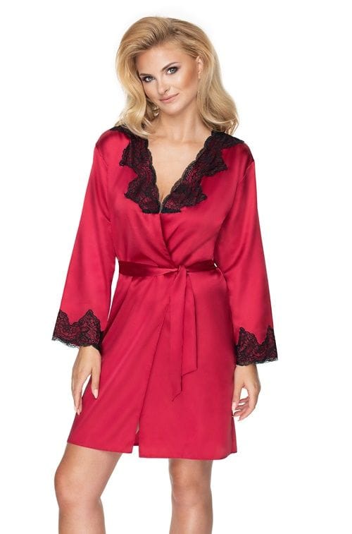 Phenomenal bathrobe in burgundy (Christmas) color. Complemented with inserts of black, openwork lace. Beautiful and feminine! Lace emphasizes the line of the neckline and decorates the sleeves at the wrists. Here is a unique, luxurious design, perfect, feminine cut, the highest quality. Composition: 97% polyester, 3% polyamide.