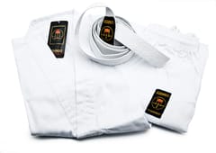 BUSHINDOK Karate OutfitOmplet: sweatshirt + trousers + white beltMaterial: 65% polyester, 35% cottonPolyester tightens the fabric and prevents creases with a high level of elasticity/rigidity. Additional features:• fabric with a smooth structure• pants are drawstringed at the waist with an elastic band with an additional drawstring for binding allows better adjustment of the size