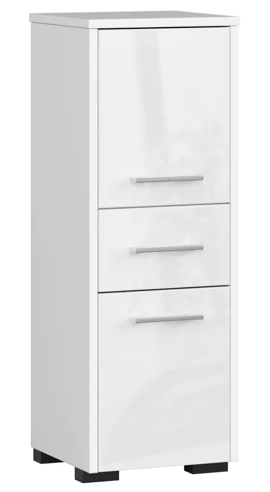 The bathroom is a place where it is very important to maintain order. This issue is easily solved by functional furniture, such as bathroom racks. The FIN 2D 1SZ bathroom cabinet-post presented in our offer is made of laminated board, from kronospan, with a thickness of 16 mm. The edges are finished with ABS edging. All this makes the cabinet resistant to scratches and mechanical damage. The post is a very versatile piece of furniture. The set includes both adjustable hanging pendants and feet for placing the cabinet on the ground. The lower part of the rack is a uniform lockable space in which towels can be successfully stored. Inside the upper door there is one shelf that allows you to segregate cosmetics. The central part of the post is occupied by a pull-out drawer. The cabinet door is decorated with silver handles.