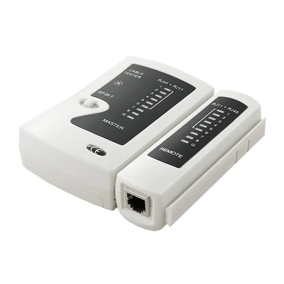 The cable network tester allows you to verify the correctness of the network cable connections that are terminated with RJ45 and RJ12 connectors. Signal LEDs show correct connection and cable tester status. The kit includes a main module that comes with a circuit breaker, LEDs and jacks RJ45 and RJ15 and a terminator that has LEDs and RJ45 and RJ12 jacks.