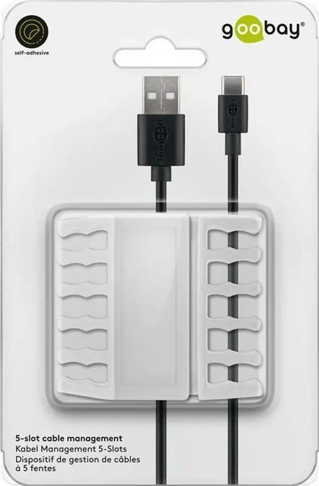Cable organizer in the form of a self-adhesive guide for five wires. Set of two pieces in white, 3M glue.