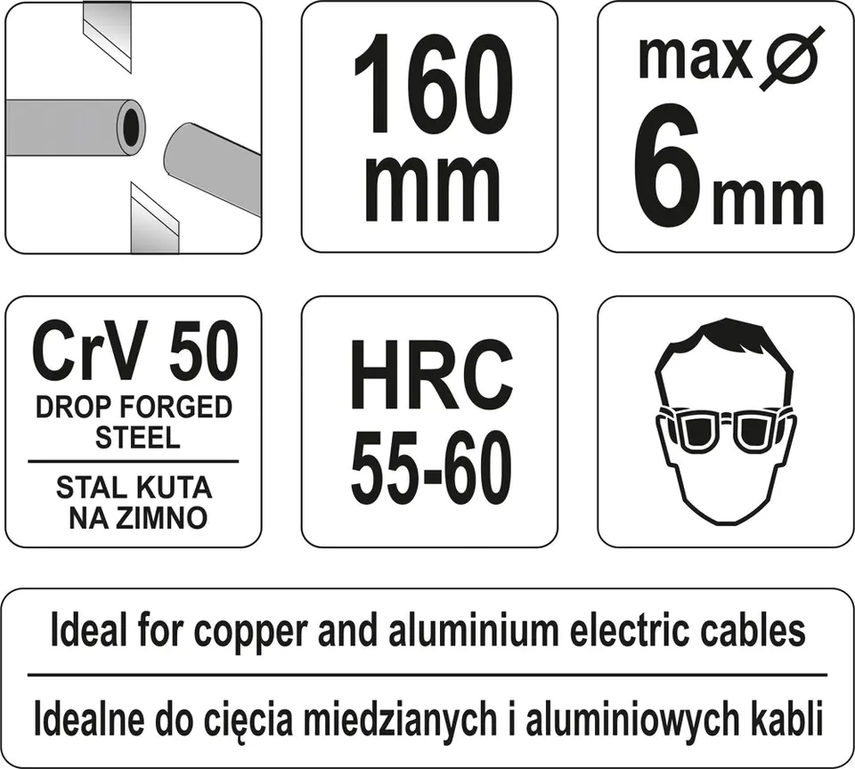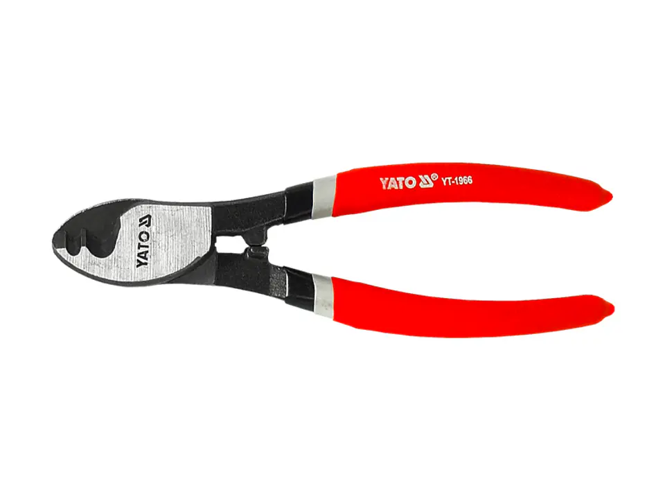 Cable shears 150mm YT-1966 YATOProfessional cable cutting pliers brand Yato. High quality tool for professional use in industry and crafts. Designed for professional use in industry, crafts, construction. For efficient, precise, cutting of aluminum and copper wires up to 6mm. Particularly useful for traditional installation and assembly work. Cold forged from cr-v 50 steel. Jaws ground and induction hardened up to 55-60 HRC. Handles protected by a three-layer cover made of special non-slip technical foam