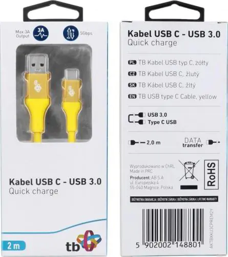 Cable USB 3.0 - USB C 2m PREMIUM 3A yellow TPE