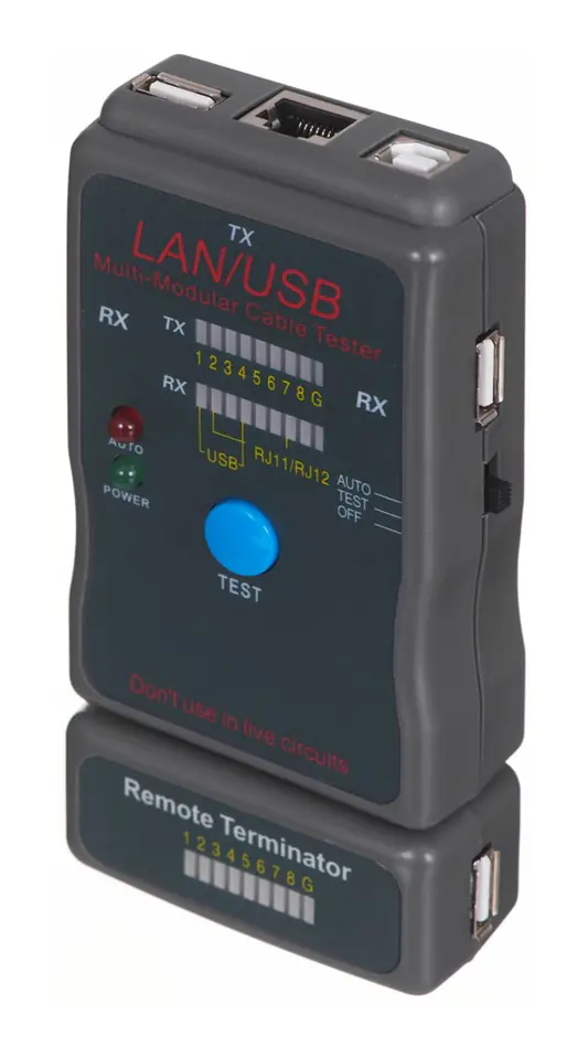 Cyfrowy tester kabli umożliwia szybkie i łatwe testowanie kabli RJ-45, RJ-11/RJ-12, UTP, STP, USB A/A i A/B, 100Base-TX, 1000Base-TX.