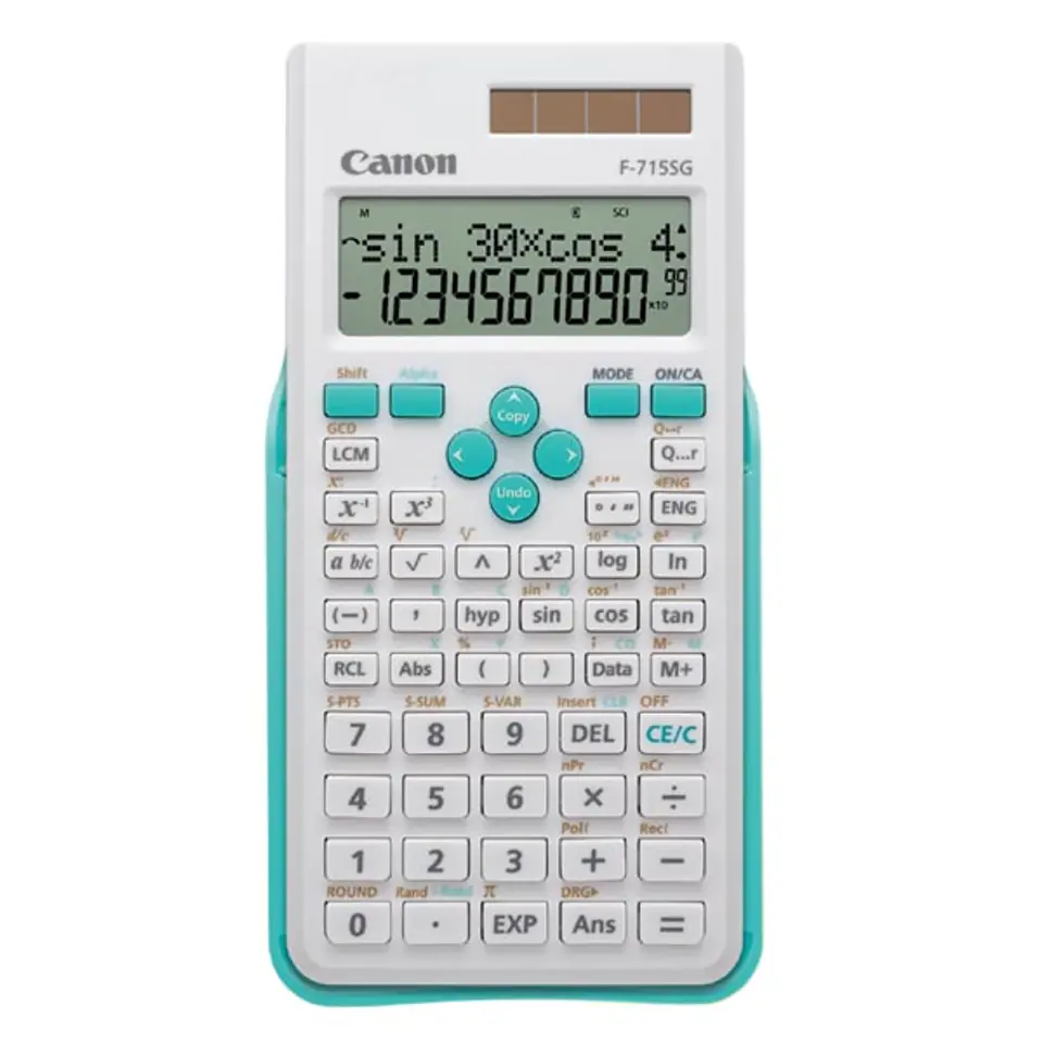 Calculator F-715SGThe advanced scientific calculator F-715SG, equipped with a two-line LCD display, is available in three different colors. It is partly made of recycled Canon materials, making it an ecological product.Clearer reading thanks to the large two-line displayIdeal for studying, examinations and solving homework - the scientific calculator F-715SG is equipped with a large, two-line LCD screen. The entered values appear in the top row and the results in the bottom row. The displayed result can contain up to 10 digits; it is also possible to raise it to a two-digit power. The display character size is 9.6 x 3.96 mm, which allows quick and precise reading of the result.250 versatile functionsThis intelligent scientific calculator has all the most important functions that students need in solving mathematical and scientific tasks in the field of general mathematics, trigonometry, statistics, physics and engineering. To solve complex calculations, the F-715SG has a total of 250 different functions. It is possible to save and recall 17 calculations so that the user can explore other formulas or concepts. What's more, internal calculations can be performed using 16 digits, providing more accurate results.Manufactured partly from recycled Canon materialsF-715SG is the right choice for practical and ecological reasons. This is because Canon uses plastic waste material to build the housing. Industrial waste is gaining a new life.Reliable dual power sourceThis scientific calculator works thanks to sunlight and battery supply, which allows you to maintain continuous reliability and confidence during exams. Use solar power when lighting conditions allow, and switch to battery power if needed. The F-715SG is signaling a low battery condition. The automatic power off function is activated after 7 minutes of inactivity, which extends battery life.Three stylish color optionsThe practical and stylish F-715SG calculator is available in black or in two variants with white - with a housing and arrows in magenta or blue. A weight of 124 g simplifies handling. The hard, retractable housing protects the numeric keypad and screen against bumps and shocks.