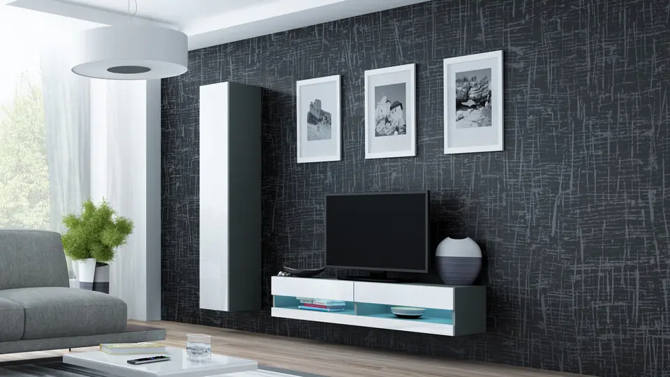 | Additional information: | Wall cabinet, The pictures show an example of an arrangement of the set., The given total dimension of the set does not include the gaps between the solids visible in the photos. Recommended distance min. 10 cm., It is possible to buy LED cabinet lighting., Laminated chipboard is resistant to mechanical stress and extreme temperatures, Handle-free fronts, Self-assembly furniture, Optional LED lighting for shelves (extra charge), TV cabinet NEW '140': 30/140/40, open front (without glass) in high gloss, one fixed front (height 7 cm), two fronts opening upwards (height 14 cm), inside two chambers, wall-mounted TV cabinet., VIGO '180' display cabinet full: 180/40/30, four regular shelves inside., Available backlight colours: cold white, red, blue, green |