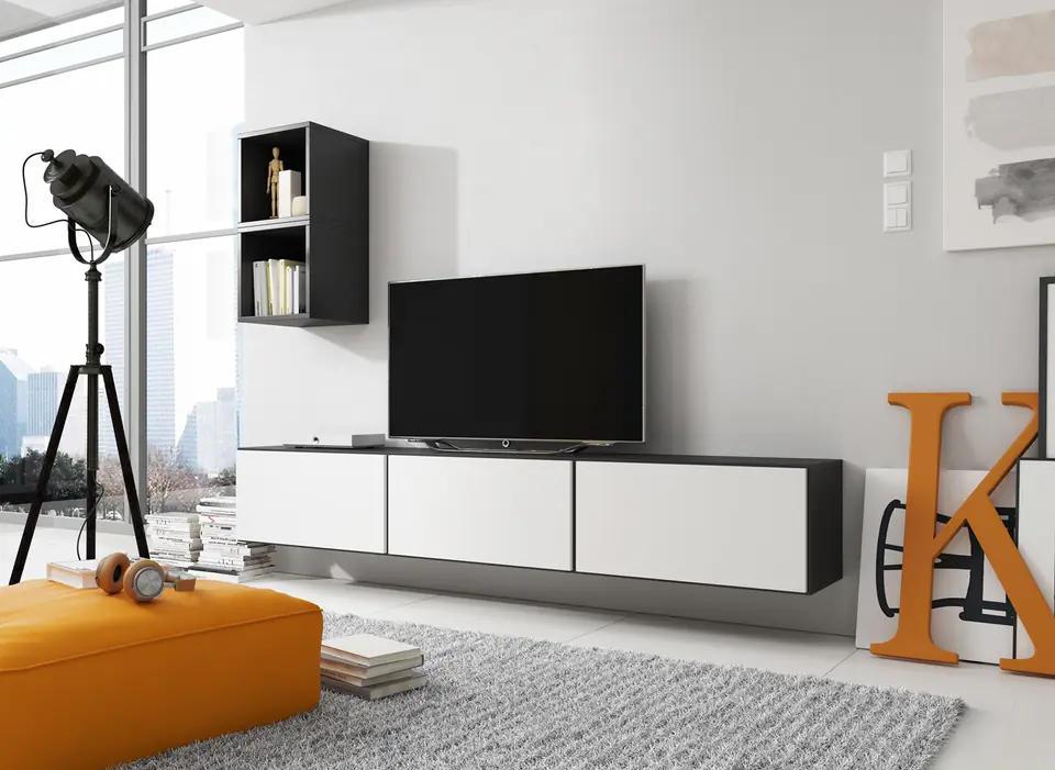| Additional information: | Laminated chipboard is resistant to mechanical stress and extreme temperatures, Cabinet RO-3: 37,5/75/39 cm: one flap opens downwards or sideways (left/right), The photos of the inside of the cabinet show the anthracite/ wotan oak colour version and are for illustration only., It is possible to buy LED cabinet lighting., If the front is to open upwards, you need to purchase gas lifts on your own (1 pieces for one rectangle cabinet), Cabinet RO-6: 37.5/37.5/39, one space - no shelf, Handle-free fronts, Self-assembly furniture, Accessories so called sliders included, The pictures show an example of an arrangement of the set., Free-standing or wall-mounted cabinet, The height and width are approximate and take into account the gaps/overlaps between the blocks shown in the photo |