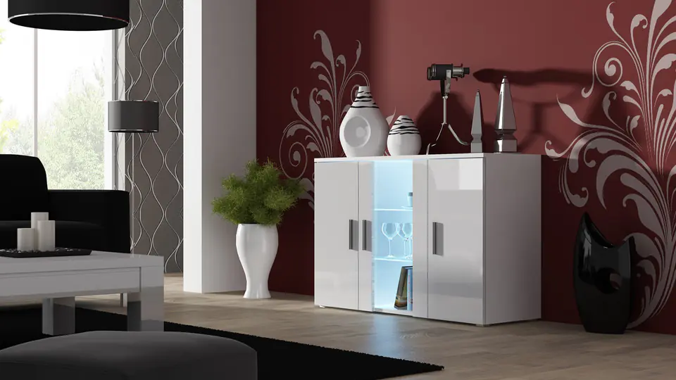 | Additional information: | Laminated chipboard is resistant to mechanical stress and extreme temperatures, Self-assembly furniture, Optional LED lighting for shelves (extra charge), The photos of the sets show an example arrangement with other furniture from the collection. The remaining models are available for sale separately., Left and right side door with high gloss fronts, one shelf inside, Available backlight colours: cold white, red, blue, green, In the centre one glass front, inside two glass shelves with optional LED lighting, It is possible to buy LED cabinet lighting. |