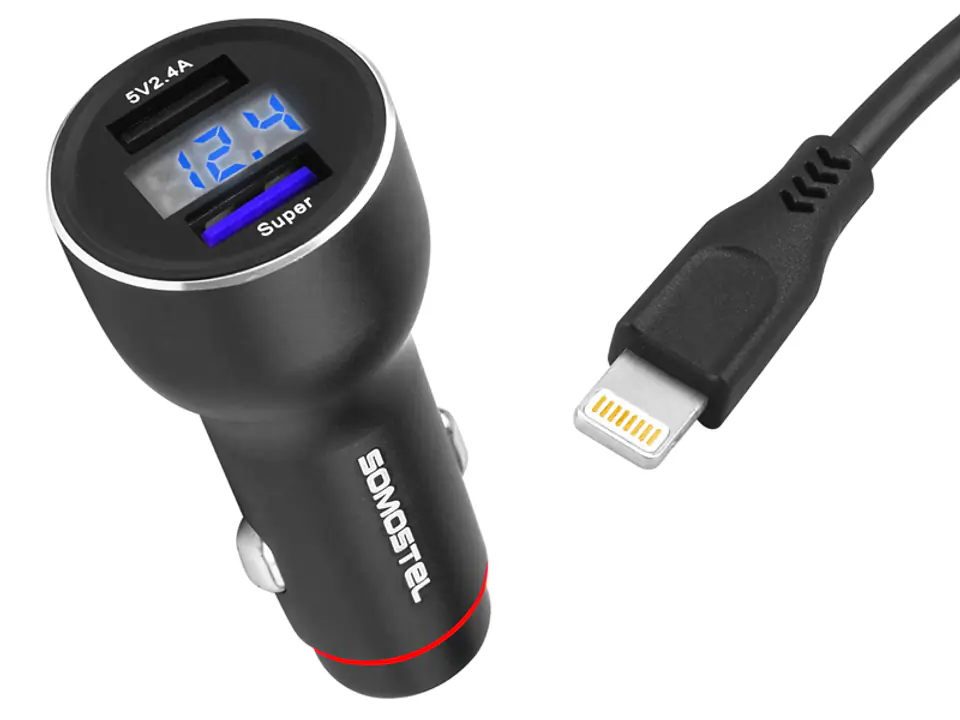 ŁADOWARKA SAMOCHODOWA SOMOSTEL 5A/30W, 2xUSB + MIERNIK, KABEL IPHONE CZARNA, SMS-A89, QUICK CHARGER 3.0.