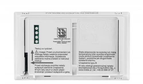 K10LLCO carbon monoxide sensor equipped with a Kidde electrochemical sensor, guaranteeing 10 years of operation. Powered by a built-in battery that does not require replacement for the lifetime of the device. This solution allows the detector to be mounted in an optimal place in the room and provides protection also in the event of a power failure in the network. Exceeding the permissible CO level is signaled optically (red LED) and acoustically (loud, pulsating sound alarm with a strength of 85dB). The device's memory stores information about the detection of CO concentration exceeding the level of 100 PPM. Thanks to this, the user can make sure that there is no emission of carbon monoxide during his absence in the room. The sensor has a test / reset button that allows you to check the operation of the device and reset the alarm signal. The efficiency control system monitors on an ongoing basis, among others: the sensor, internal circuits and the state of the battery. In the event of a malfunction or low battery level, the yellow LED flashes and an audible warning sounds. In addition, the sensor is equipped with a function that allows you to quickly check the correct response of the sensor to the CO test gas. Thanks to a specially designed housing, in addition to wall mounting, the sensor can also be placed on a flat surface, e.g. on a bedside table near the bed. It has a blockade that prevents disassembly of the device installed on the wall. After 10 years from the activation of the power supply, the sensor will remind you to replace the device. K10LLCO is marked with the B construction mark confirming compliance with the Polish standard PN-EN 50291-1: 2018 + AC 2021 for home carbon monoxide detectors. The research was carried out by the Scientific and Research Center for Fire Protection, National Research Institute. Józef Tuliszkowski (CNBOP-PIB). In addition, it has a BSI certificate confirming compliance with the requirements of BS EN 50291-1: 2018 issued by the British Standards Institution.