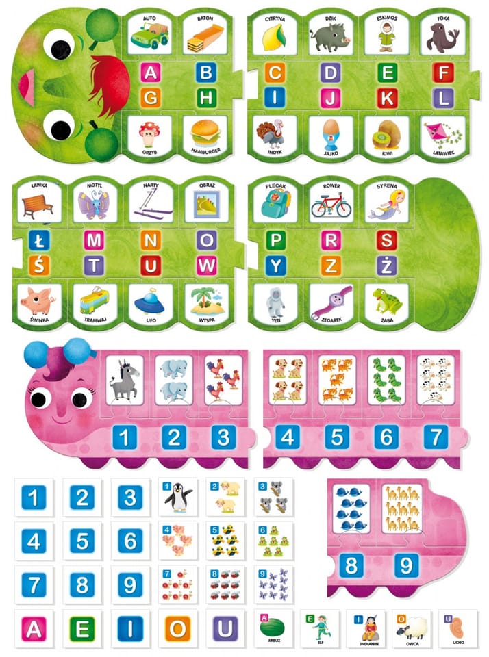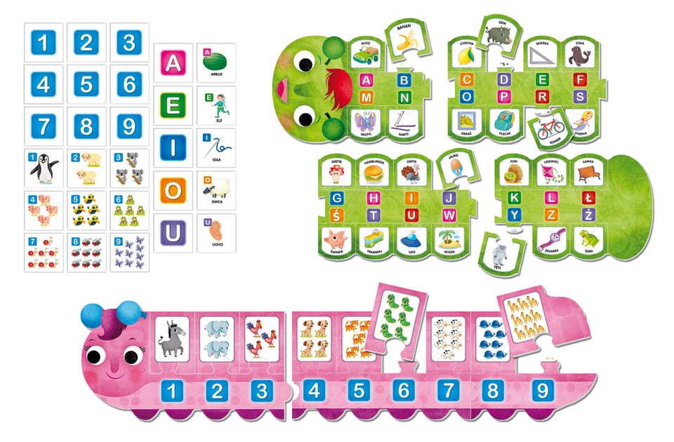The package contains 2 boards, 49 cards and 49 letters, thanks to which children will learn the first numbers and words. Learning is made more pleasant by colorful illustrations.