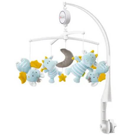 Carousel with music box, from the collection: Small Castle Charming, smiling dragons, blue bats and a plush moon will take your little one to the land of dreams. A mechanical music box with a switch/off switch allows the characters to dance and gently calms down to the rhythm of a popular lullaby. During the day, dancing characters arouse curiosity and invite you to listen, watch and admire. Delicate colors and a variety of surfaces stimulate the child's perception. The figures can be easily removed during washing. The carousel handle allows easy attachment. In this way, the carousel with music box quickly becomes indispensable at your baby's bed. The carousel is equipped with pleasant to the touch, easily detachable toys and a music box It arouses curiosity and stimulates the child's perception Delicate sounds of the music box calm and put the baby to sleep Hand-wound music box does not require batteries Easy to assemble Washable. Size : 40 cm All toys of the German brand FEHN are safe for children from 0 years, they are made of the best quality materials meet the standards EN71, CE, tested in the institutes "Stiftung Warentest"" or "Ökotest" 65084