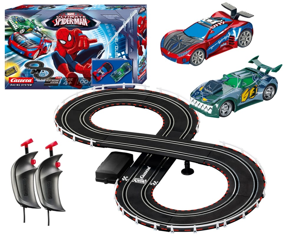 Nie ma ograniczeń dla młodych kierowców z Carrera GO!!! Zbuduj zestaw „Spider-Man” 2,4! W jego skład wchodzą auta przedstawiające bohaterów filmu „Ultimate Spiderman ‐ Goblin Getaway“. Zacznij szaloną jazdę w czerwono-niebieskim samochodzie Spider-Man za uciekającą zielono-żółtą wyścigówką przestępcy Goblina, poczuj się jak w filmie produkcji MARVEL. Czas udaremnić plany Goblina i ścigać się na torze CARRERA. Na prostych nie tylko padają rekordy prędkości, ale rozgrywają się także szalone pościgi obu zaciekłych rywali. Kto zwycięży?