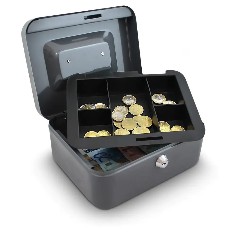 Brand new, high-quality metal case for storing or transporting coins, banknotes or other valuables. A sturdy and handy metal case equipped with a coin sorter is an ideal place to store banknotes and coins. At the bottom there is a lot of space for bills, receipts, coins, banknotes and other useful items, for example. For safety, the case is locked. The ergonomic handle makes transport child's play.