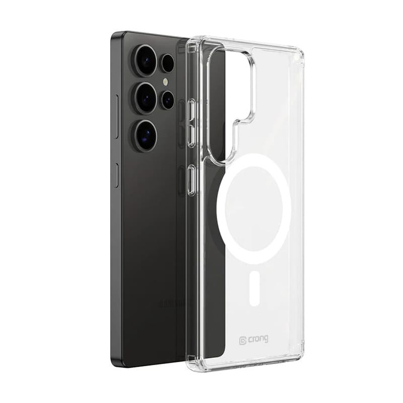 Crystal Shield Magnetic is a hybrid protective case with an integrated magnetic ring for the Galaxy S25 Ultra. The high-powered N52 magnets allow the use of available accessories and MagSafe chargers (e.g. MagSpot Stand). The high-quality magnets used in the CRONG brand case allow you to charge your phone in a faster and safer way, as they guarantee a more stable flow of wireless energy.