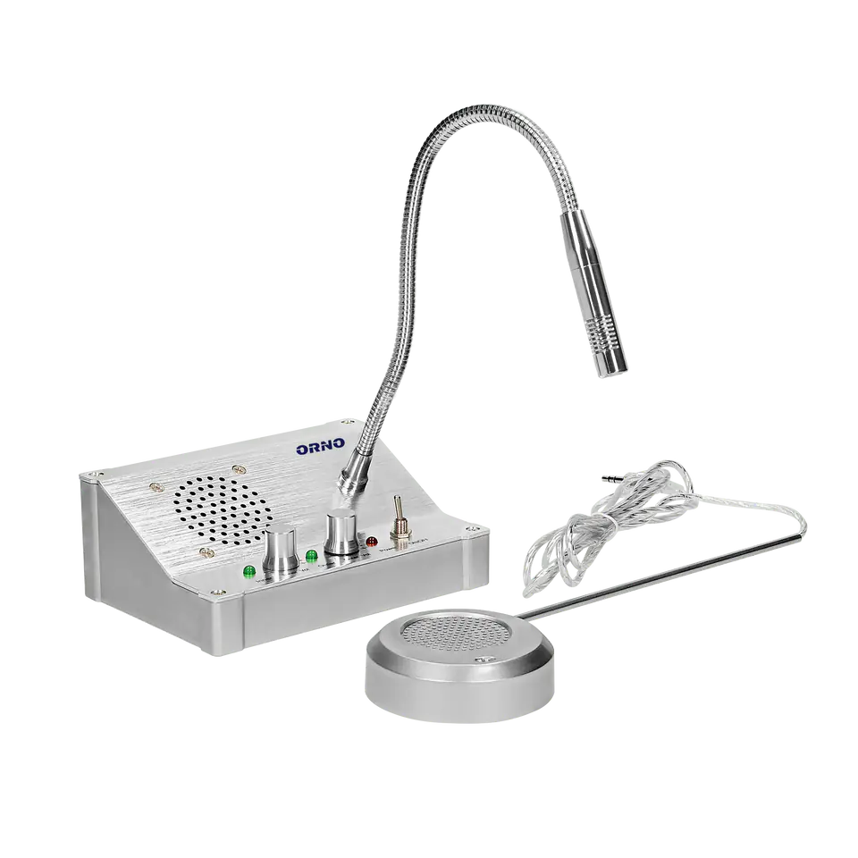 An intercom set that enables secure communication in the cash windows of banks, hospitals, health clinics, railway stations, post offices and other places where contact with the customer takes place. Conducting a conversation does not require close contact between participants and the use of hands. The intercom provides a high-quality voice call and is simple to use, while additional potentiometers allow you to adjust the volume smoothly. The cashier's microphone has a flexible boom, making it very easy to customize to suit your individual needs.
