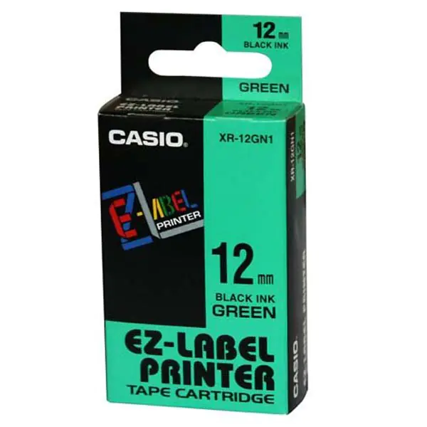 Casio original label printer ribbon, Casio, XR-12GN1, black print/green backing, unlaminated, 8m, 12mm