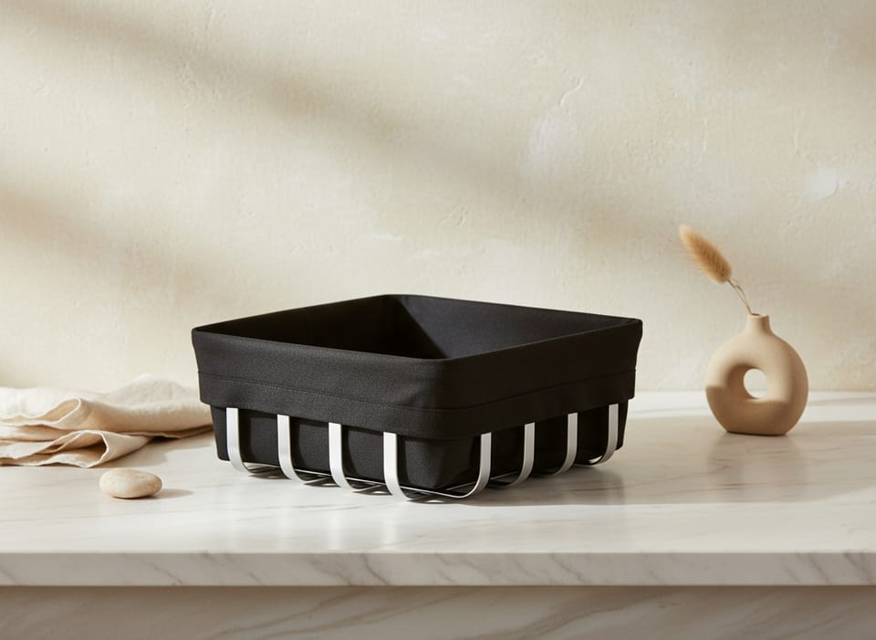 Square metal silver basket from the CASSIE series by COOKINI. Padded with black material. Ideal for a kitchen table to serve bread or to store various small things. Basket:length 22cm