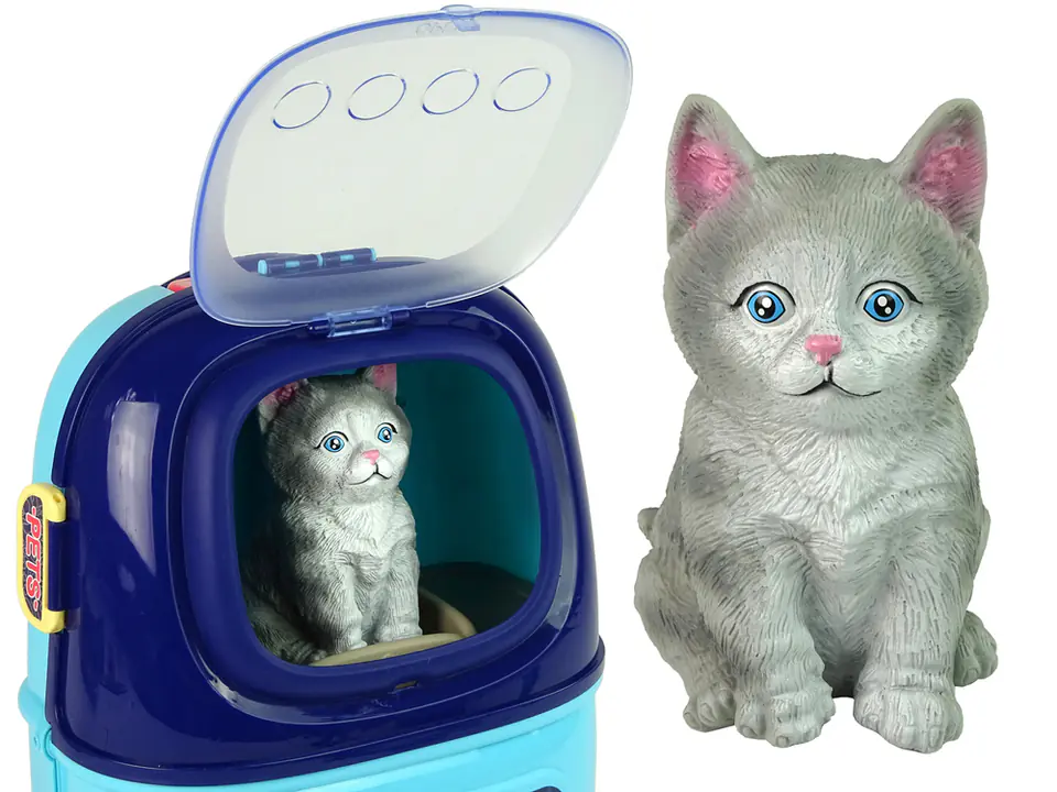 The entire beauty salon is housed in a blue wheeled suitcase with a retractable handle. The toddler can take the toy and his friend everywhere with him. Convenient to transport and carry. At the bottom of the backpack you need to put all the accessories, disassemble the side shelves and you're done. Transparent window with holes will allow you to constantly observe your toy pet. On the road, when our kitten gets hungry, we can open the glass and give him food. The whole gives many opportunities to play and will please every child, he will not be able to part with this set.