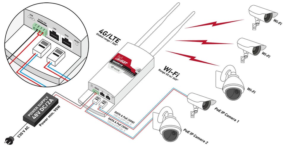 GLOBALCAM4.5G-2POE industrial router is designed for professional CCTV video surveillance applications, provides transparent and smooth wireless transmission between IP cameras and NVRsThe device is designed for wireless connection of multiple IP cameras with the recording point via 4G/LTEW InternetBuilt-in Wi-Fi module enables cooperation with wireless cameras supporting IEEE 802.11n standards