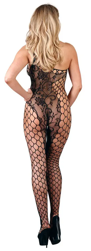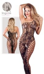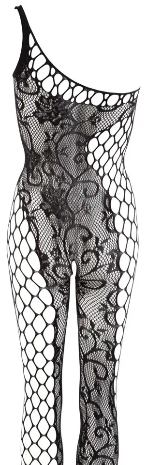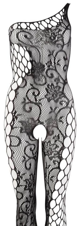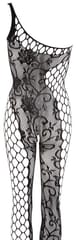 Beautiful catsuit with asymmetrical floral pattern on one strap. Slit in the crotch, full feet with reinforced toes. Color: black. Size S-L. Composition: