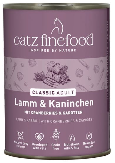 Specialty for cats – valuable food for our pets. Catz finefood N°11 contains a lot of delicate lamb, rabbit and healthy additives such as cranberries and carrots. No preservatives, dyes or flavor enhancers. Does not contain GMOs. Mmmmiau!