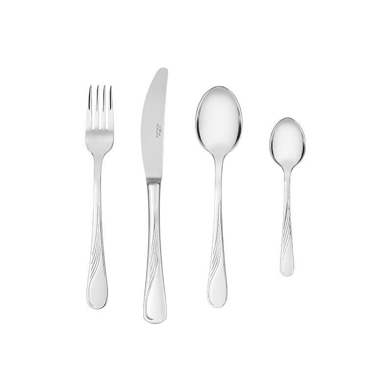 The combination of traditional CELESITA cutlery design from the Polish manufacturer GGERLACh with a delicate ornament is the essence of good style. Grooves emphasize their elegant, classic form and give them lightness. The composition of the cutlery set: dinner knife - 6 pieces, dinner fork - 6 pieces, dinner spoon - 6 pieces, teaspoon - 6 pieces