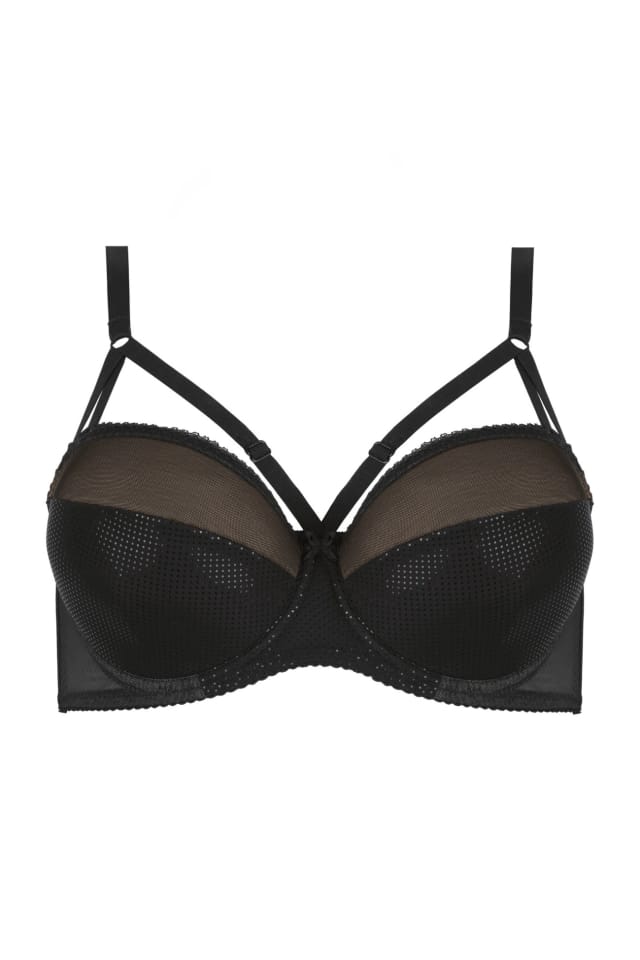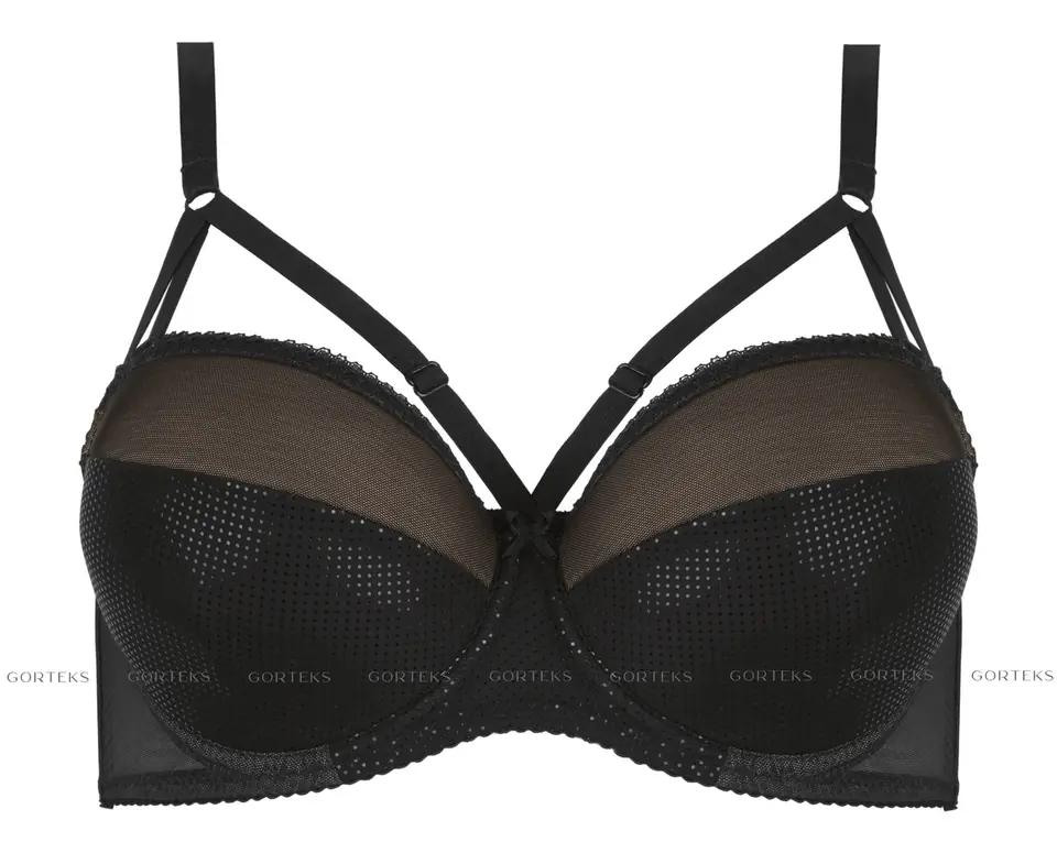 Niezwykle zmysłowy i kobiecy biustonosz usztywniany doskonale kształtuje i utrzymuje biust. Górna miska pokryta czarnym tiulem elastycznym oraz wykończona elegancką koronką, dolna – obszyta czarną dzianiną w drobne, mieniące się kropeczki. Ozdobne paseczki w okolicy dekoltu oraz delikatna kokardka między miskami dodają biustonoszowi zniewalającego uroku.