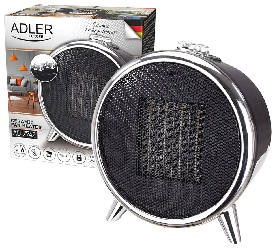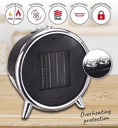 Radiator with powerful ceramic heater. The temperature in the appliance is thermostatically controlled. The heater has 2 levels of heating power, 750W or 1500W. It has a safety switch that automatically cuts off the power if the unit is overturned and an overheating protection.