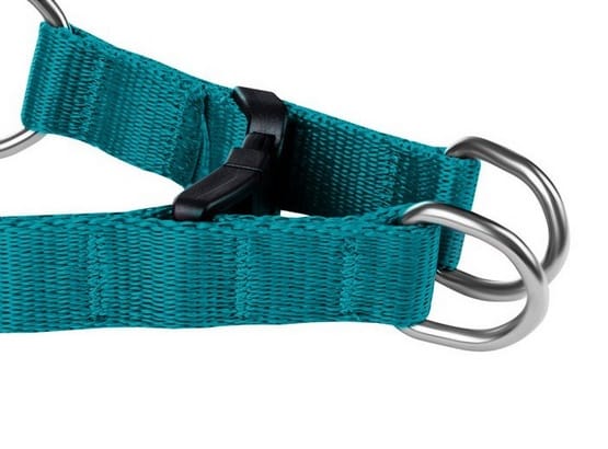 A solid plastic latch allows you to quickly and easily put harnesses on your dog.