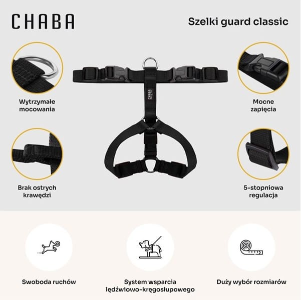 Chaba guard harnesses are made of durable, resistant to use and dog-friendly materials with all the necessary approvals. The product was manufactured in Poland, in a professional, modern machine park dedicated to specialized dog accessories.