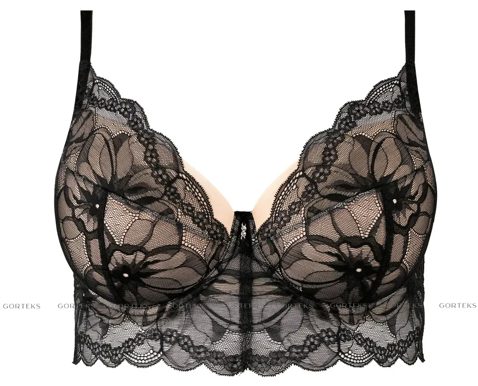 Piękny biustonosz usztywniany doskonale uwydatnia i podtrzymuje piersi. Miseczki pokryto elegancką, czarną koronką o kwiatowym wzorze.