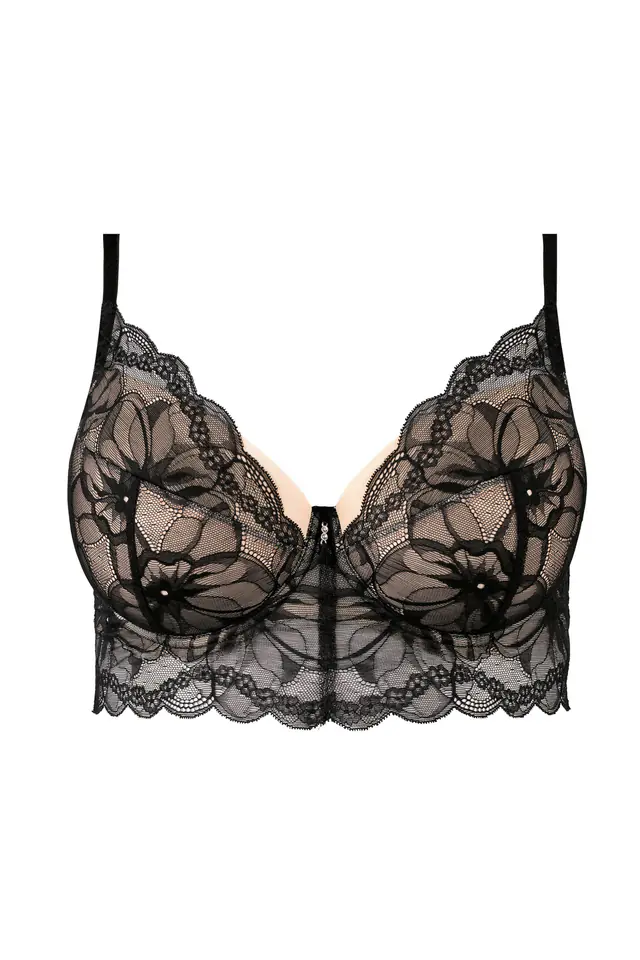 • Plecy wykonane z elastycznego tiulu w kolorze beżowym i czarnej koronki,