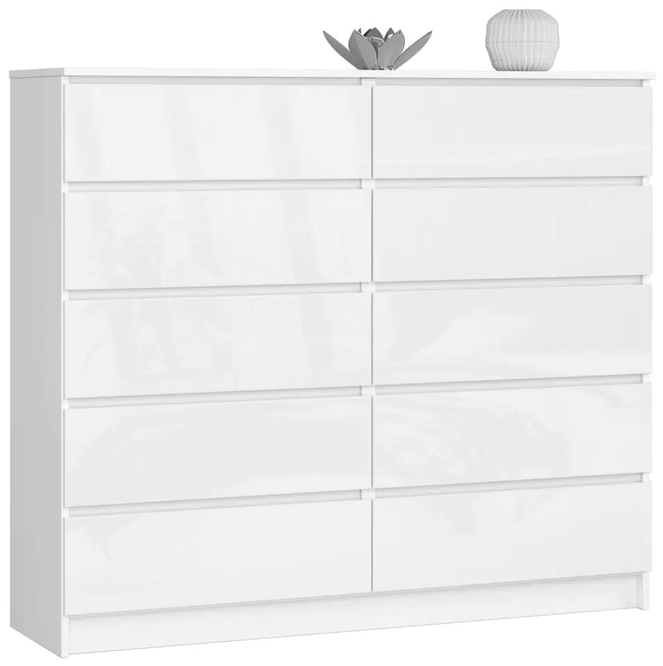 A high-gloss white chest of drawers offers plenty of storage space. It is equipped with as many as 10 spacious drawers. Thanks to this, it is ideal for the bedroom to store items of clothing, such as underwear, socks or pajamas. It will look great in a representative living room as a decoration of the room, and even in the dining room, because you can store elements of tableware, napkins and cloths in it.