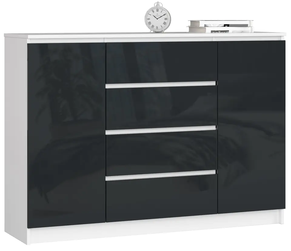 Two-tone chest of drawers K 140 with 2 cabinets and 4 drawers is made of MDF with acrylic coating (manufacturer Kronospan). The body of the furniture has been kept in white tones, while the fronts of cabinets and drawers are made of contrasting high-gloss plate in graphite. The chest of drawers is designed symmetrically. Its central part is a row of 4 drawers, while the left and right sides are cabinets with single doors opening towards the outside of the furniture. The drawers are pull-out thanks to metal roller guides and provide convenient storage thanks to the generous space. Each of the cabinets of the chest of drawers is equipped with 2 shelves.