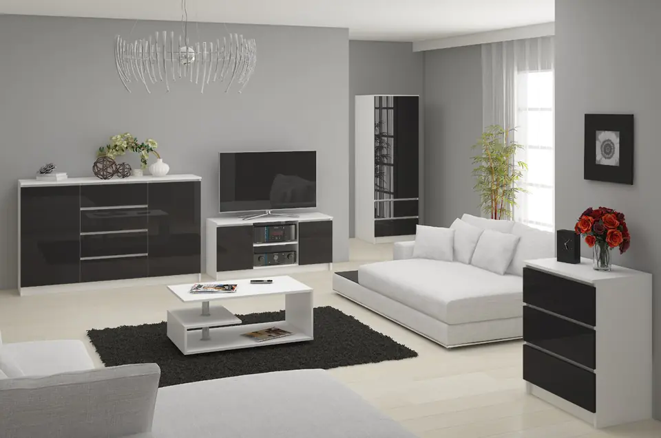 The chest of drawers, model K 140, was made in a very attractive style. The white of the body is combined with dark graphite to a high gloss, which gives an amazing visual impression. The furniture gently shines, which gives an effective play of light on its surface. Thanks to this, it brings freshness to the room and perfectly enlivens it.