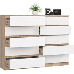 The presented chest of drawers is 160cm long, 121cm high and 40cm deep. It has as many as 10 capacious drawers, guided on metal roller guides. You get a lot of storage space, and thanks to the drawers, keeping things organized will be very easy. You will successfully find everything, you gain maximum functionality. It is a combination of capacity and high quality workmanship.