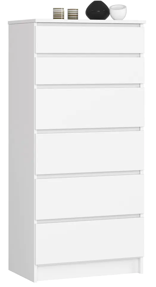 Stylish spacious and bright living room also need the right furniture and accessories. For customers looking for a color-matched and quality chest of drawers for their interiors, we have prepared a great product made entirely of laminated board. The white chest of drawers looks great and matches the décor of other furniture. It has 6 practical drawers up to 40 centimeters deep, in which you can place all the necessary accessories. The chest of drawers has a height of 130 centimeters, so it allows you to set additional accessories or TV equipment on its surface. Durable walls are made of a thick 1.6 mm board, which ensures appropriate strength parameters. The edges of the chest of drawers have been additionally protected with veneer, which will protect the furniture against bruising or other mechanical damage. Great colors, as well as a simple practical look of the furniture will certainly allow it to match other products in your apartment. In addition, the chest of drawers has cabinets with built-in roller guides, which greatly facilitate the ejection and closing of individual chambers. The sold product is issued in a version for self-assembly, we also attach the necessary instructions on how to carry out this process.