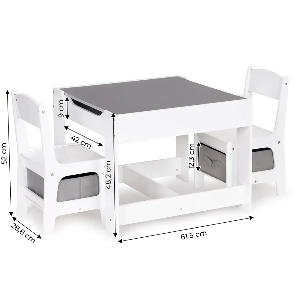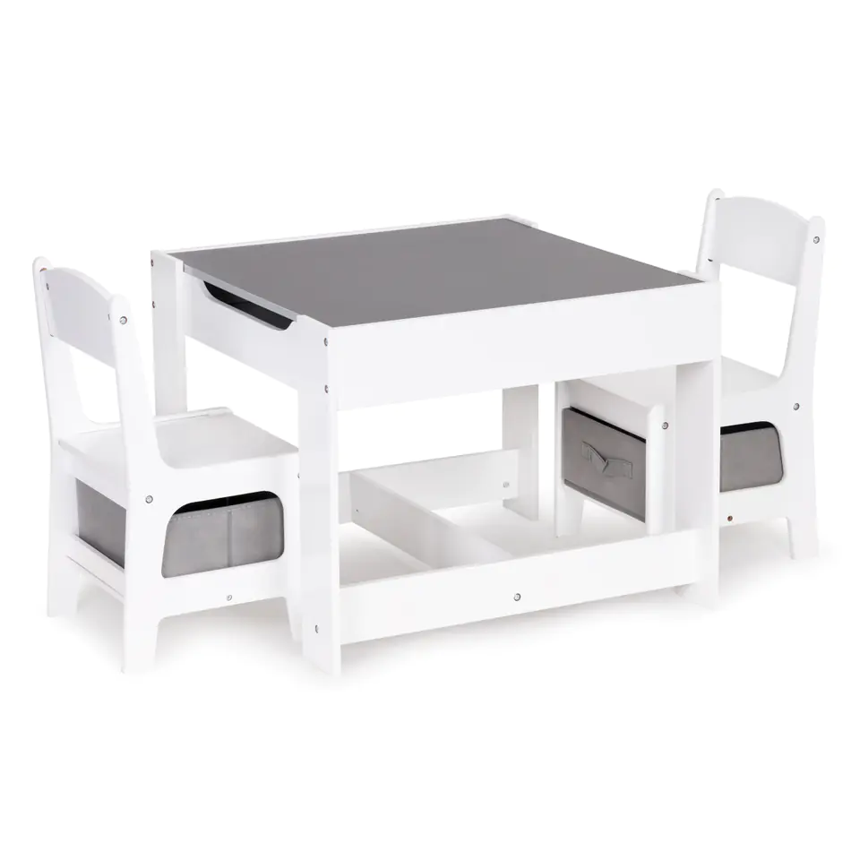 A great set for all children, thanks to its simple form, will perfectly fit into the decor of children's rooms, playrooms or waiting rooms. The set is made of MDF, which makes it resistant to damage / scratches. The set is complemented by two stable and comfortable chairs that have functional baskets under the seat, ideal for storing toys.