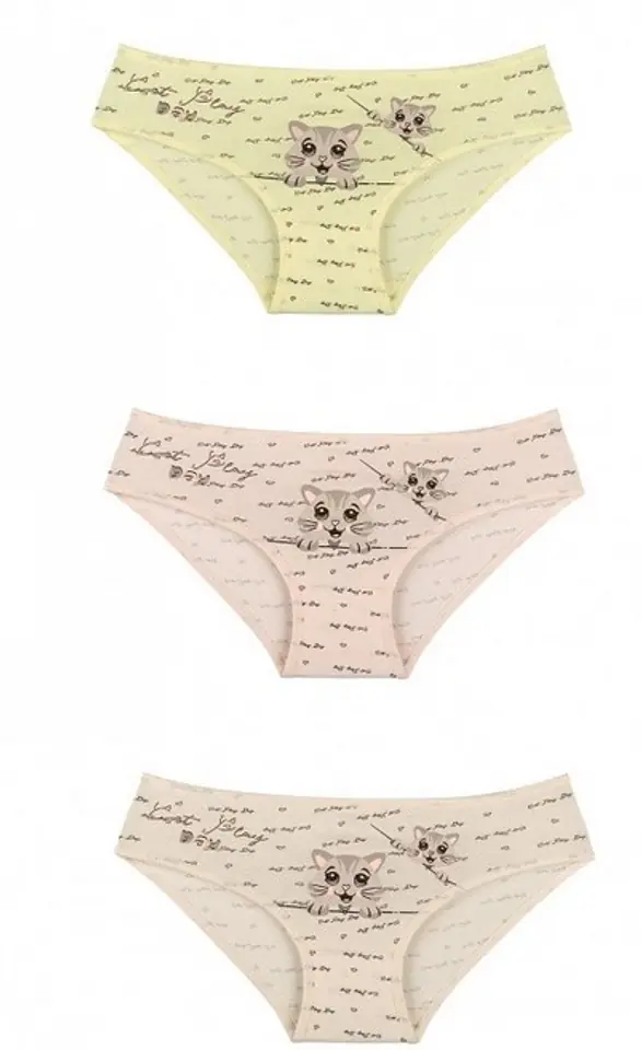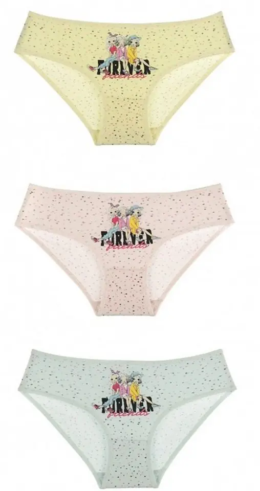 3pcs. in the package. NEW DESIGNS! ILLUSTRATIVE PHOTOS! Girls' briefs with a classic cut made of delicate cotton decorated with a colorful print. Packed in three pieces, the price is for one piece. They are available in a mix of colors.