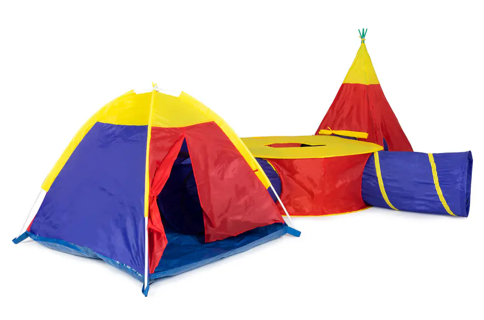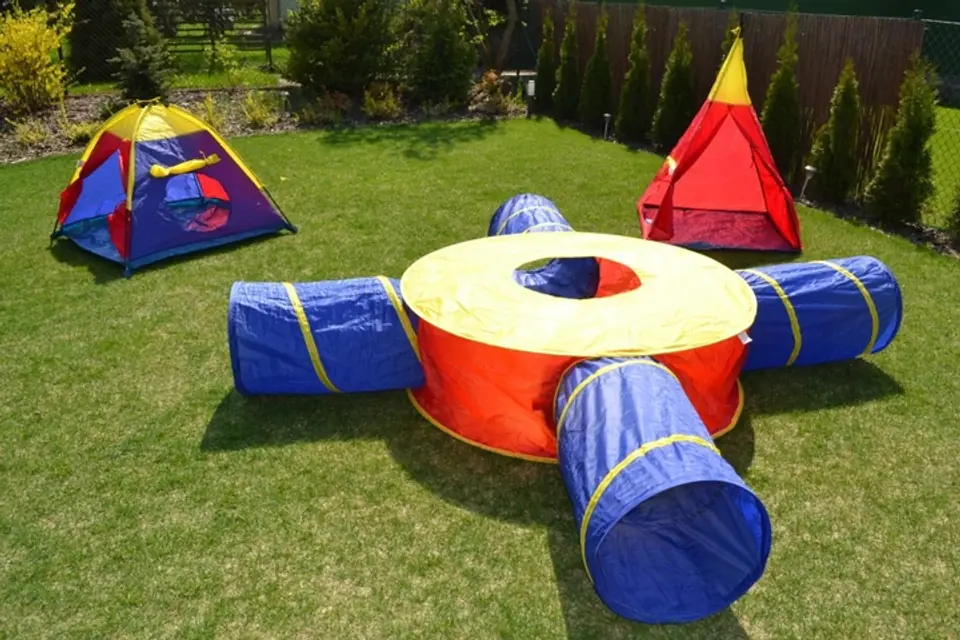 A set of 7 different tents, combined into one large playground is a great way to have fun in the fresh air. Thanks to the universal design, the possibility of configuring and combining elements is unlimited. Each part of the playground can be used separately , which is why it is ideal for both home and garden. It is great fun even for a few children, it works great during birthdays when children can play together.