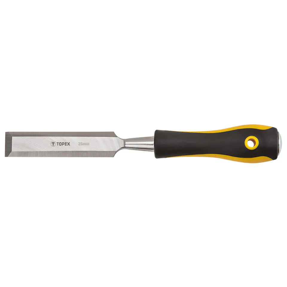 The TOPEX carpentry chisel (ref. no. 09A425) with a blade width of 25 mm is designed for woodworking. Made of high quality chrome-vanadium steel, with reinforcement for conquering, which ensures high comfort of work. It has a two-material handle, properly contoured, which fits perfectly in the hand and does not slip out of it. An excellent solution for both professional carpentry workshops and small DIY jobs with a passion. The TOPEX brand is addressed to DIY enthusiasts.