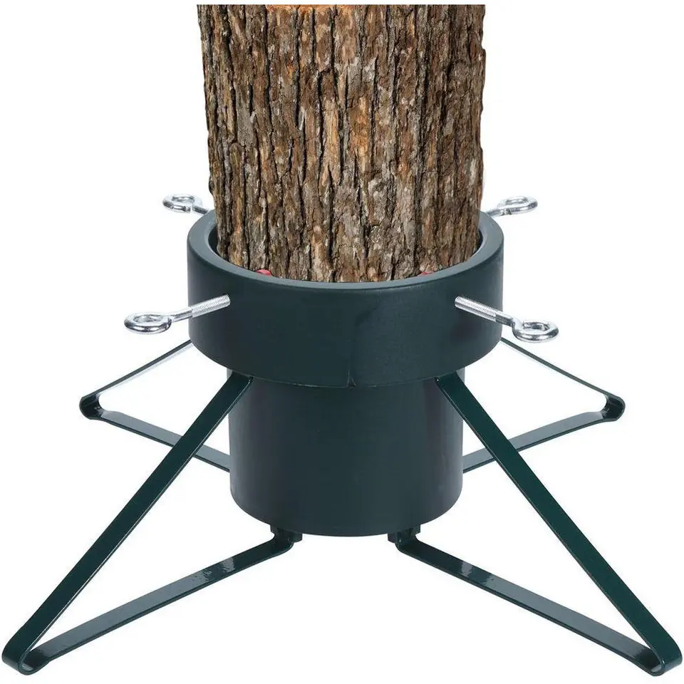 Christmas tree stand made of metal on 4 stable legs. Stand equipped with a water container. Thanks to such a container, our Christmas tree stay fresh longer. The container is made of strong plastic in green. The trunk of the Christmas tree is fixed with four screws.