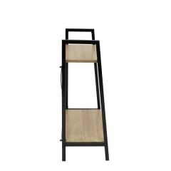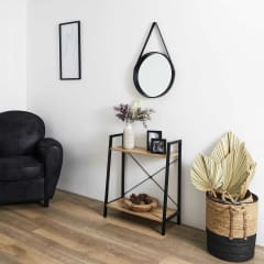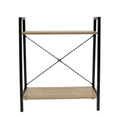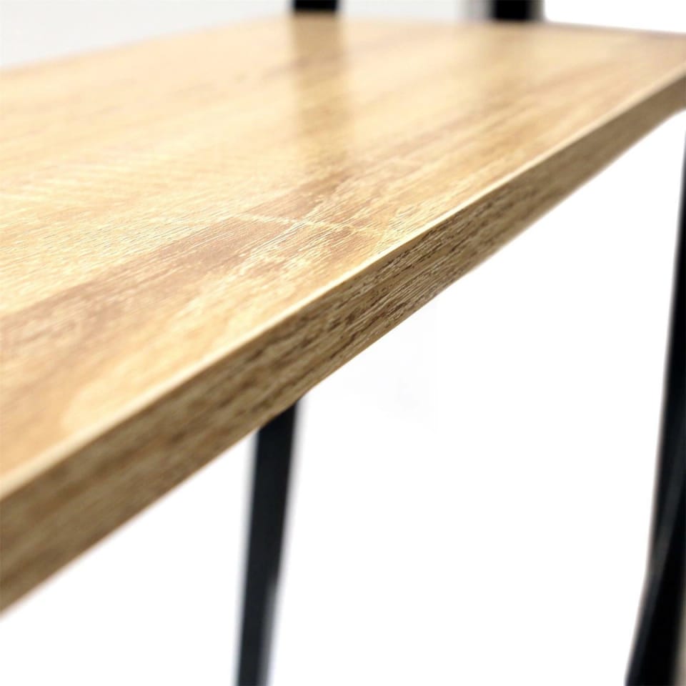 Cilyan bookcase is a unique piece of furniture for modern and loft rooms. The bookcase, thanks to the combination of black color and light oak, looks extremely light and neat. The powder-coated black furniture frame is characterized by high durability, resistance to corrosion, high temperature and mechanical damage, thanks to which it significantly increases the usability and aesthetic value of the furniture. In turn, two shelves are high-quality MDF covered with laminate imitating wood, thanks to which the surfaces of the shelves are smooth and durable. The simple structure is supported by steel rods, which, in addition to the function of the bracket, are also an interesting decorative element. Cilyan can perform the functions of a nightstand, a shelf for shoes or a bookcase in the office. Max. load per shelf: 10 kg. Distance between shelves: 46cm, Dimensions of Cilyan S shelves, width 55cm, depth: top: 22cm, bottom: 26cm