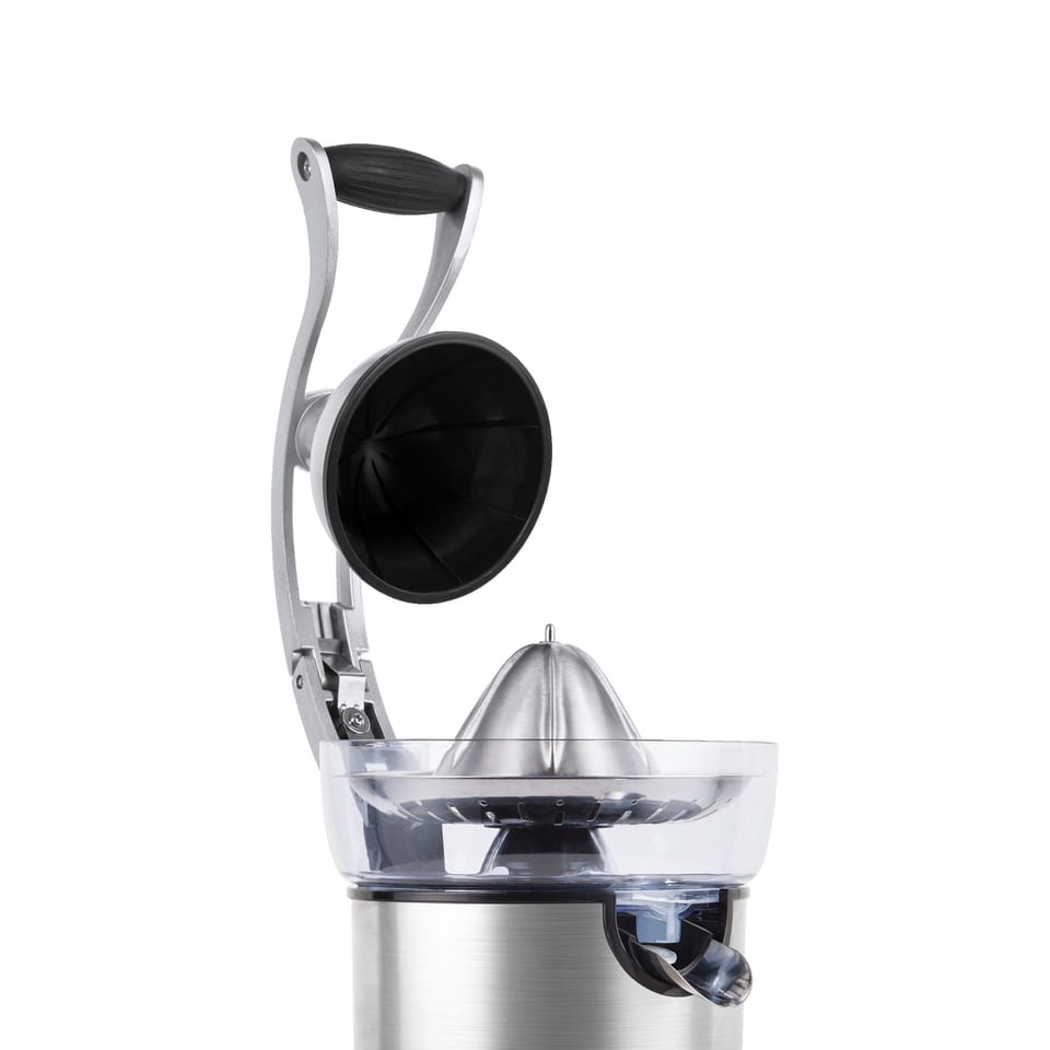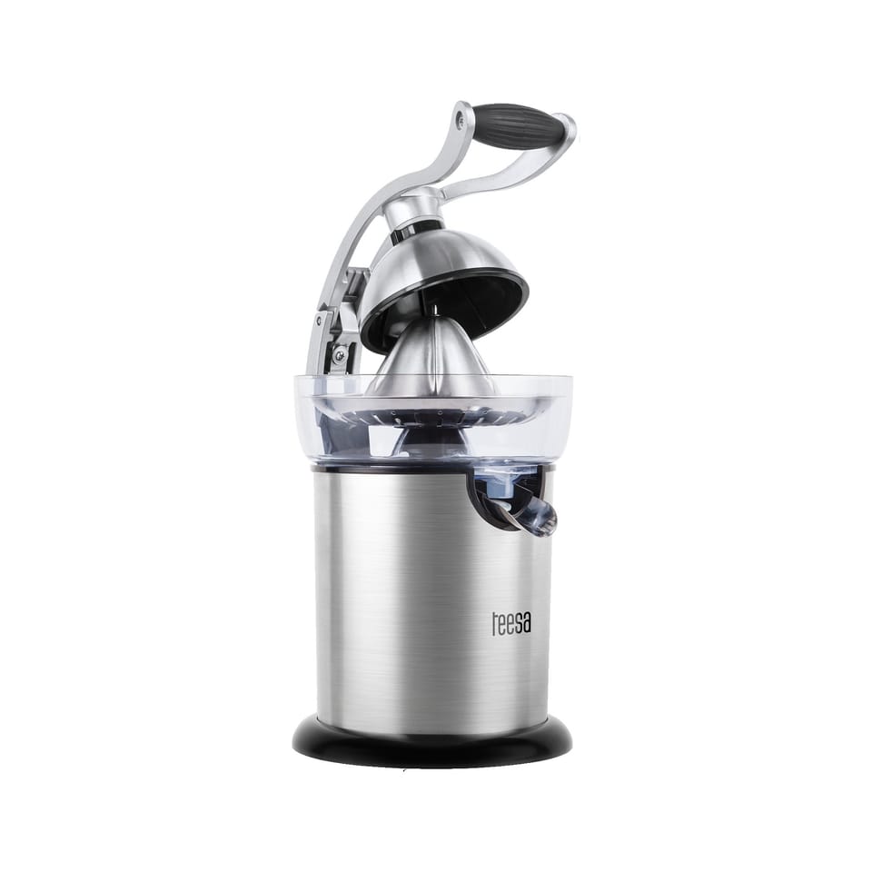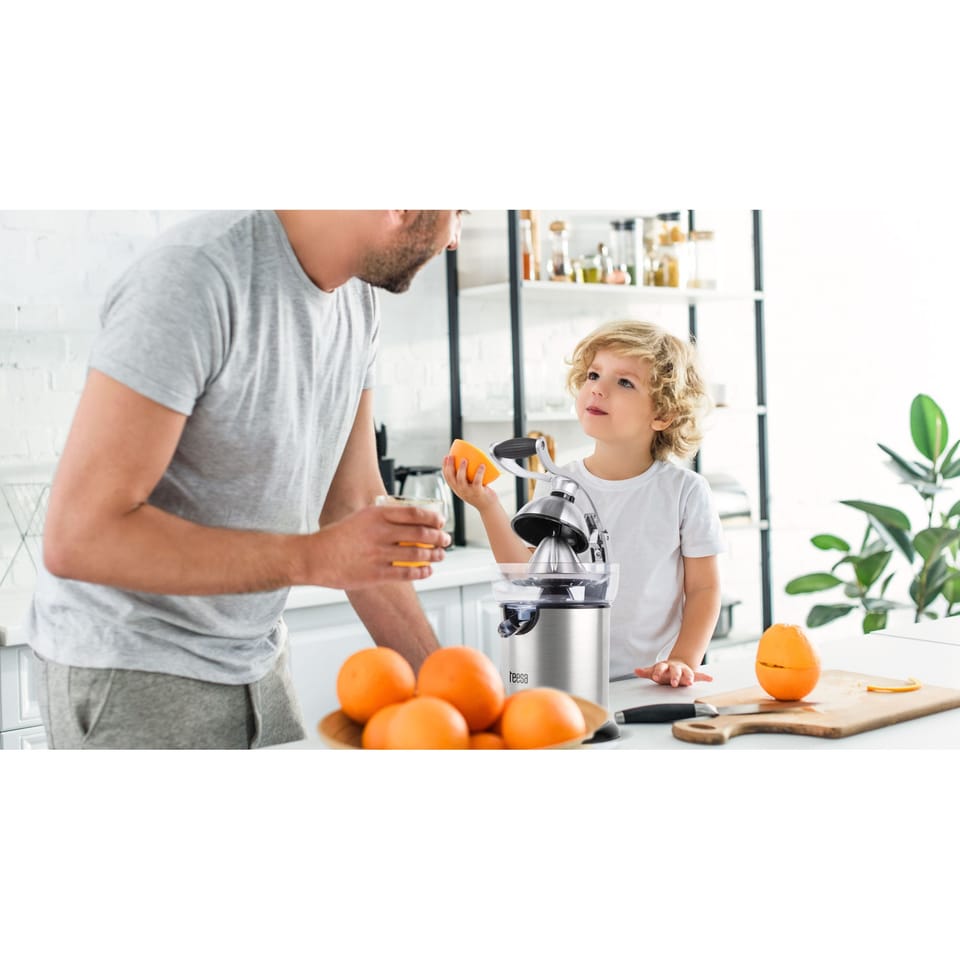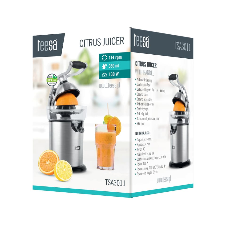 Sour lemon juice, sweet orange juice, or slightly bitter grapefruit. If your family loves juices from freshly squeezed citrus , we have a device that will easily help you prepare them. The Teesa TSA3011 automatic juicer, with a special handle, will squeeze the juice from your favorite fruits to the last drop. It is enough to cut the fruit in half and put it on a cone, then press the handle. Spinning at 114 revolutions/ minute, the cone will extract juice full of vitamins , which you can store in the tank of a 350 ml device or pour directly into a glass.